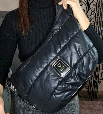 Sac GUESS double matière "doudoune/similicuir" - forme banane - dimensions : 45 cm de largeur x 25 cm de hauteur - plusieurs poches intérieures - fermeture zippée - poignées et bandoulière
