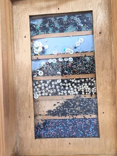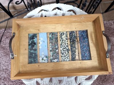 Unique, plateau avec 2 poignées en bois avec boutons, perles en déco. 25 cm x 36 cm