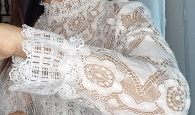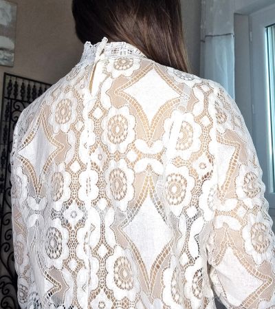 Blouse blanc cassé dentelle motifs fleurs, made in Italie, de belle qualité. Taille XL