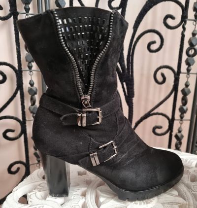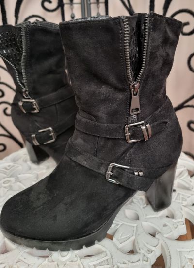 Bottines élégantes à talons en daim, avec boucles sur le côté et finition strass à hauteur de la cheville. talon 9 cm - Moderne et élégante à la fois.