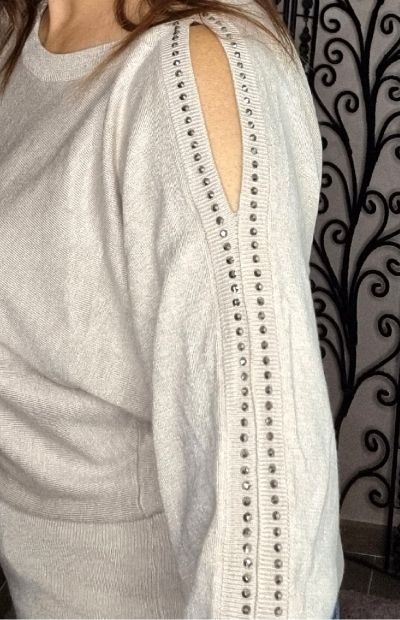 Pull beige manches chauves-souris strass - fentes sur les épaules - taille unique, correspond à 38 jusqu'au 42 - Viscose/polyamide - hauteur dos : 60 cm - largeur : 100 cm